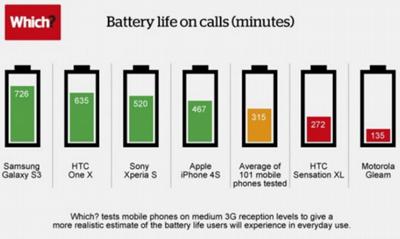 Το Samsung Galaxy S3 κατάφερε να ολοκληρώσει 726 λεπτά κλήσεων, 91 λεπτά περισσότερα από το δεύτερο.